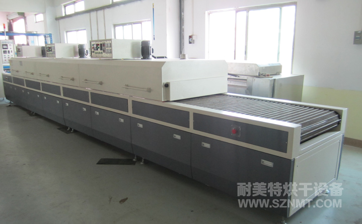 烘干爐部分外形尺寸:總長18米,外寬1.34米,網帶寬1.1米,總高1.22米,進料部分長10米,烘干部分長6.0米,緩沖區長0.3米,冷卻區1.2米,出料部分長0.5米;